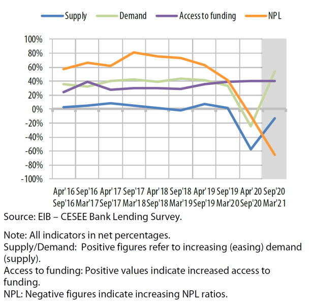 “Despite the relentless pandemic, the financial systems in the CESEE region are still coping. International banks are showing their commitment to the region. The decline in demand for investment financing is worrying in light of the twin green and digital challenge that economies in the region are facing. To reignite investment and in order to tackle the green and digital transformation to remain competitive in the long term, public support and coordination will be key,” added EIB Chief Economist Debora Revoltella.