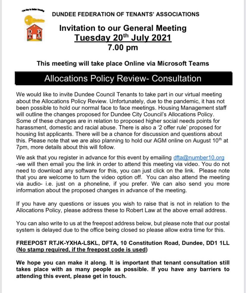 Dundee Federation of Tenants Associations is inviting Dundee City Council tenants to take part in the housing allocations policy review consultation meeting to be held online next Tuesday evening.