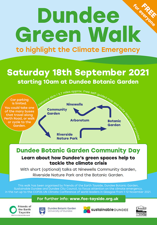 Friends of the Earth Tayside is organising the Dundee Green Walk tomorrow – Saturday 18 September – in conjunction with the University of Dundee Botanic Garden, where it will start (at 10 am) and finish.