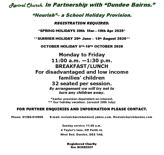 Partnering with Dundee Bairns in 2020, Revival Church is proposing to provide school holidays provision of breakfast/lunch for disadvantaged and low income families’ children.