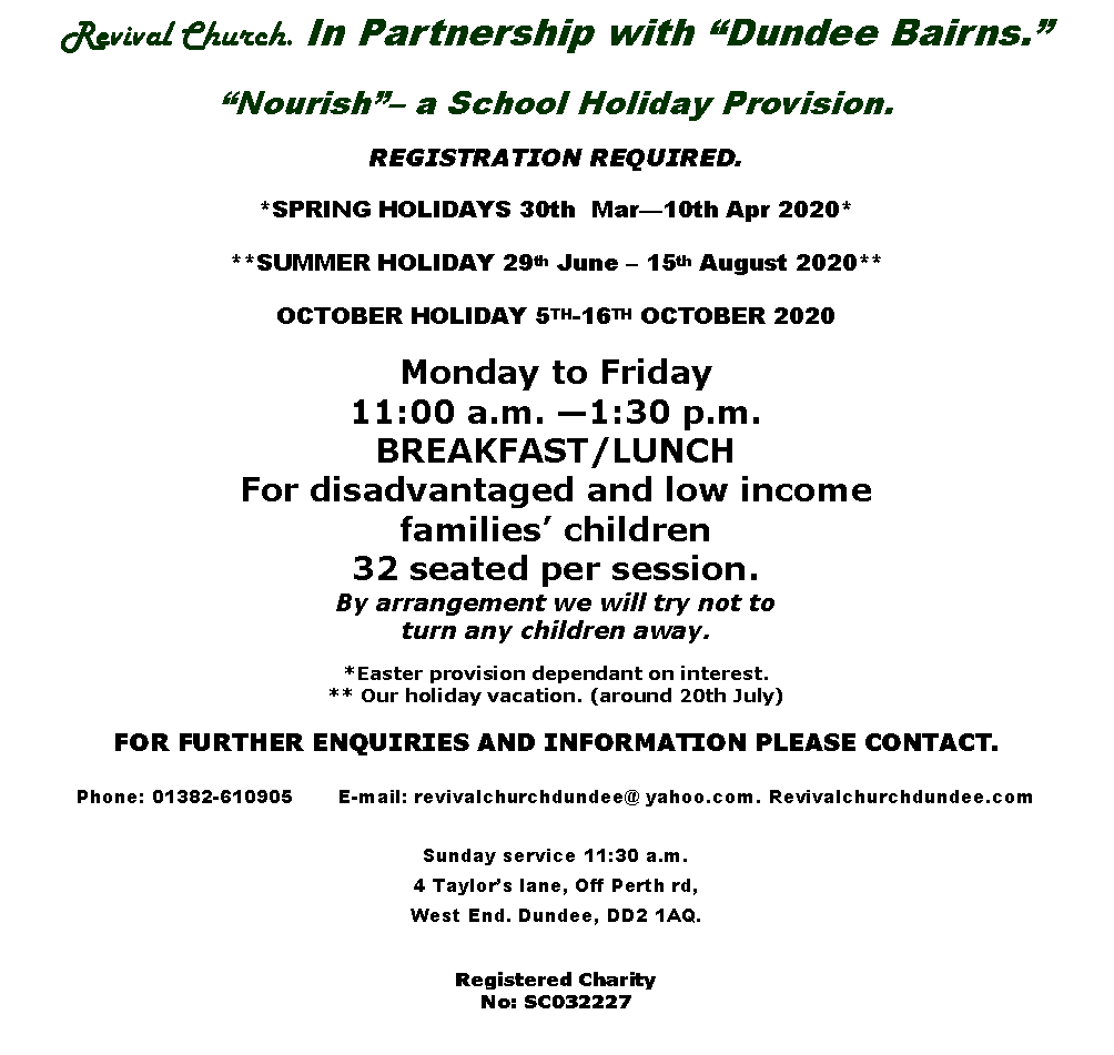 Partnering with Dundee Bairns in 2020, Revival Church is proposing to provide school holidays provision of breakfast/lunch for disadvantaged and low income families’ children.