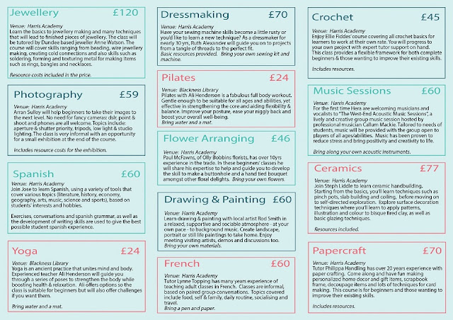 Here’s the details of the upcoming evening classes from Harris Education and Recreation Association – together with information about enrolment night.    You can click on the images below to enlarge and can also find more details are available here :