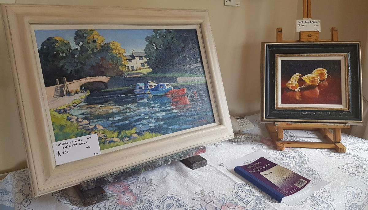 There are superb paintings on the “Lady in Red” theme as well as John’s Scottish landscape paintings as well as some still life studies.