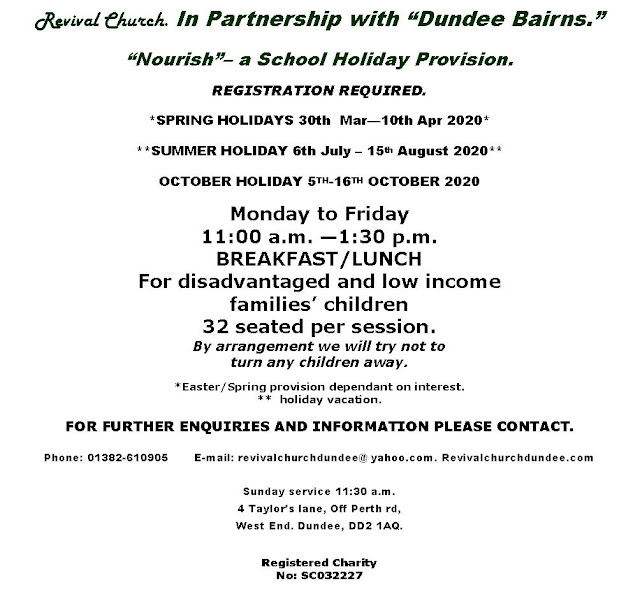 Just a reminder that, partnering with Dundee Bairns in 2020, Revival Church is proposing to provide school holidays provision of breakfast/lunch for disadvantaged and low income families’ children.
