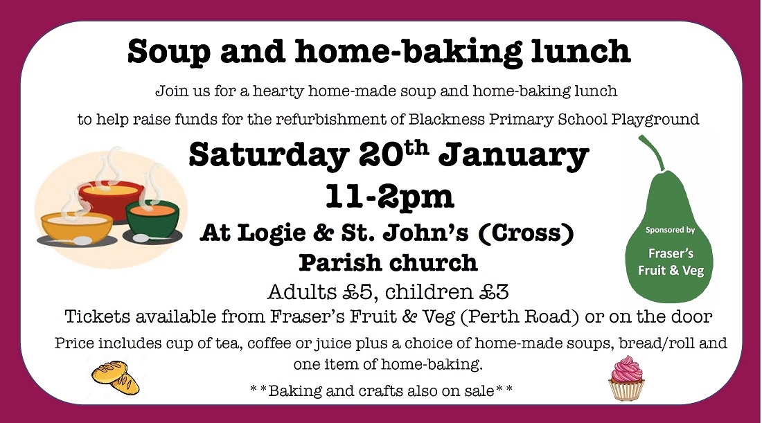 A reminder about this Saturday’s soup and home baking lunch, in aid of the Blackness Primary School playground fundraising project :
