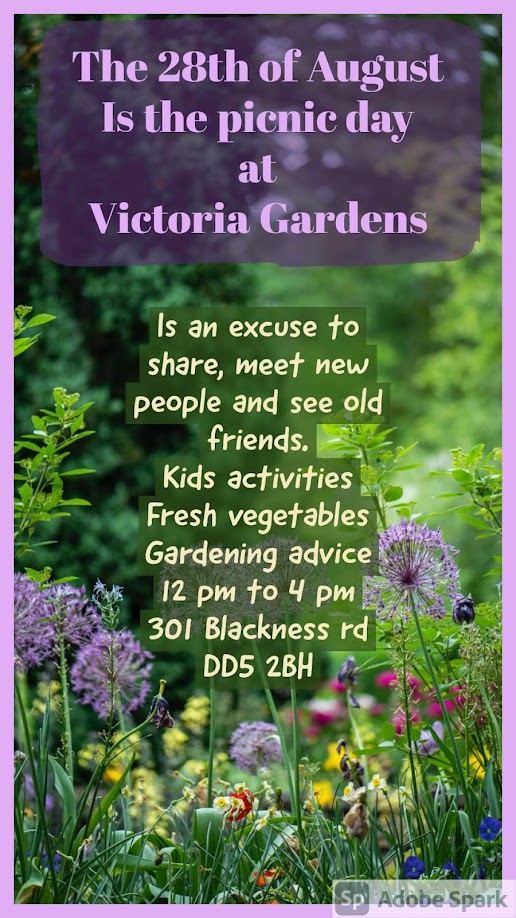 The Victoria Gardens community garden is having a family picnic day tomorrow –  Saturday 28th August – 12 noon to 4pm – all welcome :