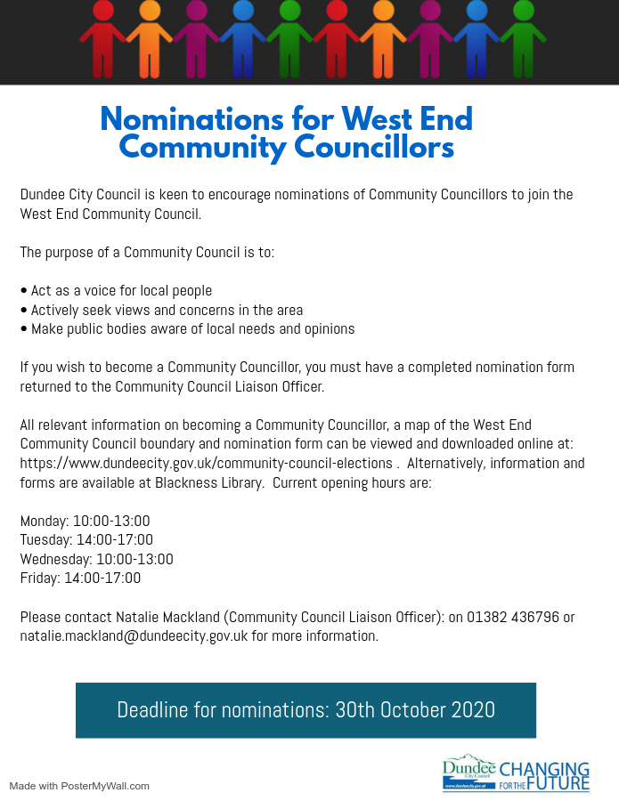 West End Community Council is calling for nominations for new Community Councillors as there are spaces to fill. West End Community Council has space for up to 10 more Community Councillors.